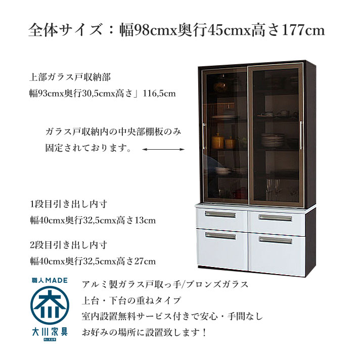 食器棚 幅100cm 完成品 キッチンボード 無垢 引き戸 カップボード スライド 奥行45 日本製 白家具 ホワイト ブラウン 白 高さ180 キッチン収納棚 鏡面仕上げ おしゃれ インスタ映え アンティーク 大川家具 送料無料 北欧 モダン ガラス戸タイプ食器棚 激安 セール