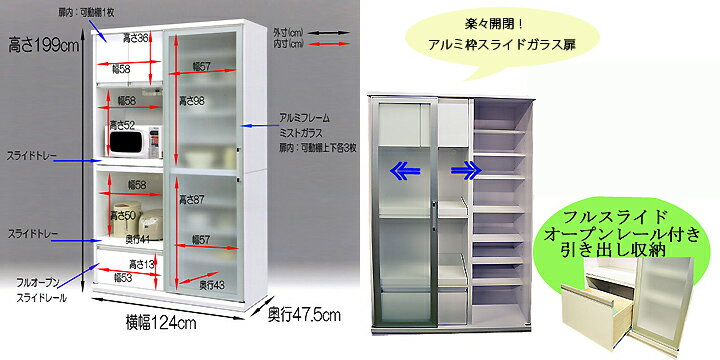 商品詳細説明 サイズ[本体]幅:124cm ×奥行き:47.5cm ×高さ:199cm【OP内寸】上/幅58×奥行41×高さ52.5cm下/幅58×奥行41×高さ51.5cmカラー/色ホワイト(白色)テイストスタンダード/シンプル/カジュアル/おしゃれ設置お部屋ダイニングルーム/キッチンルーム 材質前板:MDFエナメル塗装/ミストガラス扉/扉フレームはアルミ枠仕様製造国日本(福岡県大川市)国産品セールスポイントスライド式の扉なの収納、取り出しが場所をとらず楽に出来ます。